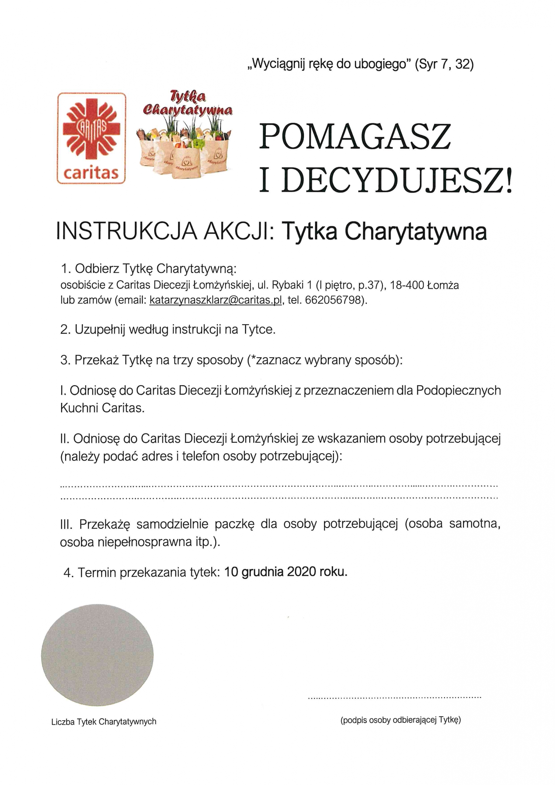 DOŁĄCZ DO GRUPY DZIAŁANIA: WSPARCIE i…. weź udział w Tytce Charytatywnej! Tytki są już dostępne w Caritas Diecezji Łomżyńskie ! Akcja trwa do 10 grudnia! Dołącz do nas! Pomagasz i Decydujesz!