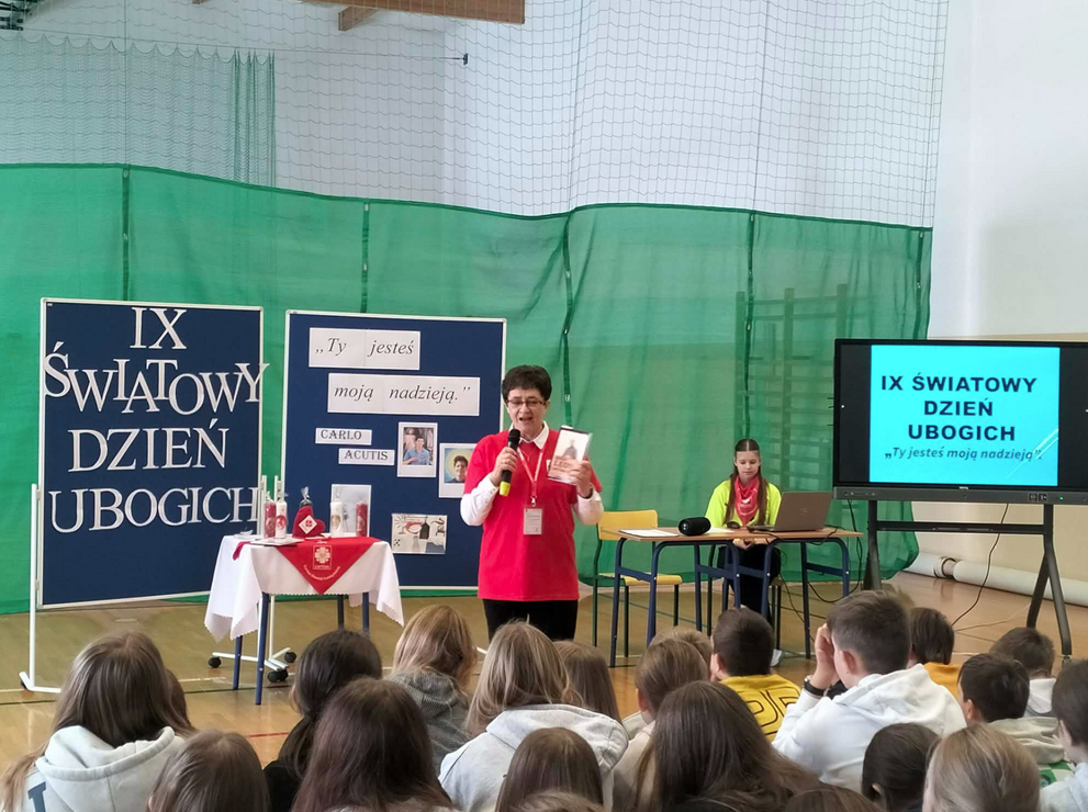 Prowadząca spotkanie koordynatorka SKC i PZC Pani Maria Ciszewska, bardzo mocno podkreślała czym jest ubóstwo – wyjaśniając, że to nie to samo, co bieda. Papież Franciszek wielokrotnie przypominał: „Ubogich zawsze u siebie mieć będziecie”: w domu, w szkole a i sami ubogimi jesteśmy, gdy doznajemy prześladowań, krzywdy, niesprawiedliwości z najbliższego otoczenia. Gdy szukamy pomocy u psychologa, psychiatry. A może wystarczy, by drugi człowiek obok nas był życzliwy, serdeczny…?