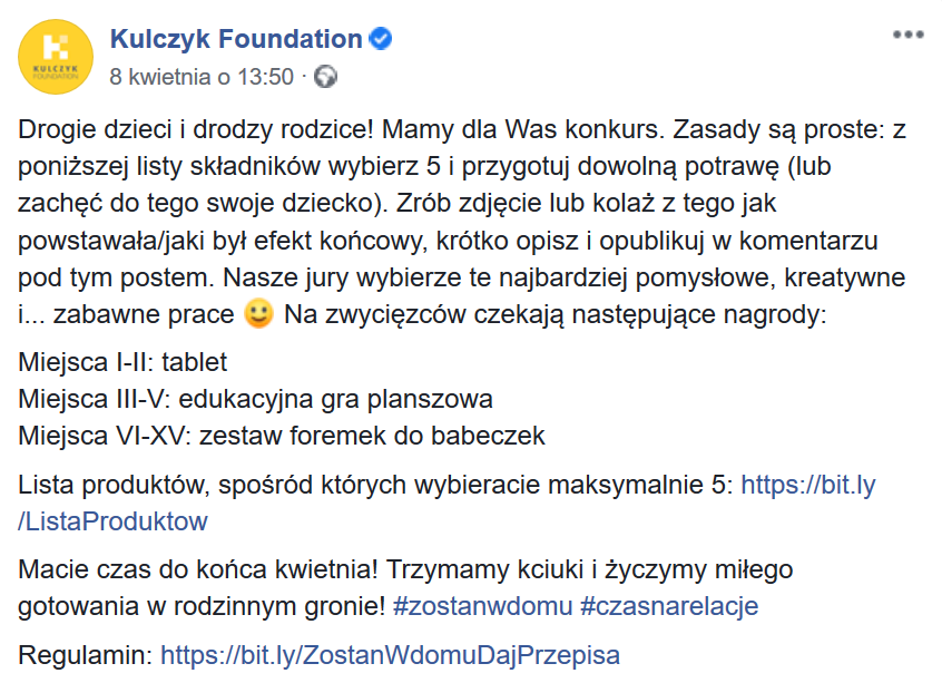 Kulczyk Foundation zaprasza dzieci i rodziców do udziału w konkursie „Zostań w domu i daj przepisa”