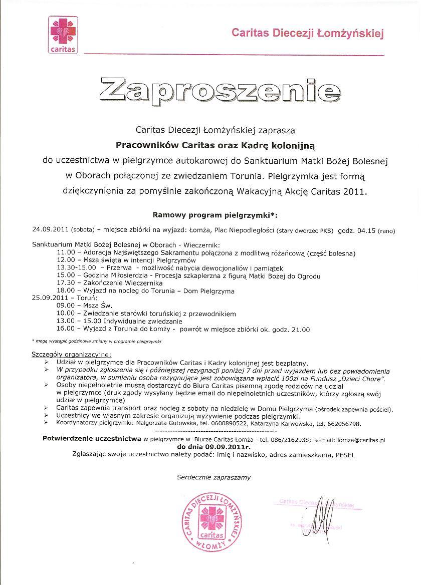 Zaproszenie dla Kadry kolonijnej i Pracowników Caritas na pielgrzymkę